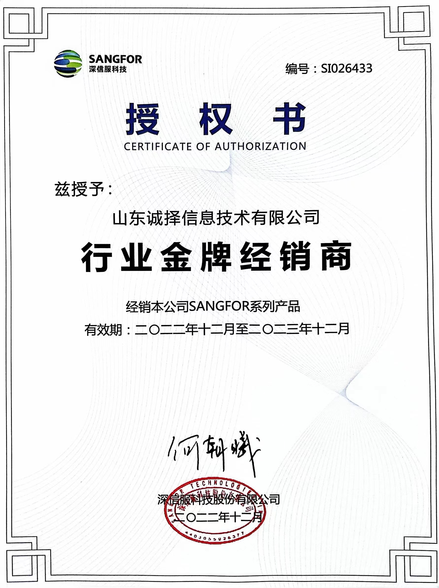 深信服科技授权证书