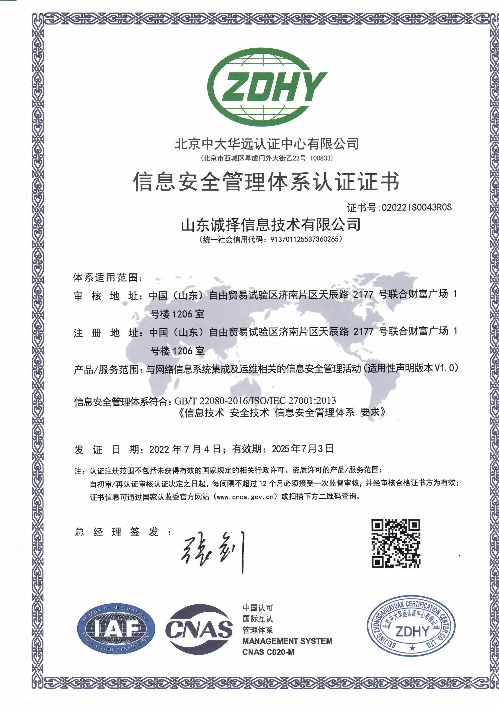 信息安全管理体系认证证书